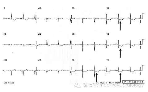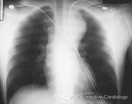 所有疑为主动脉夹层的患者都应当进行心电图检查。累及主动脉根部的撕裂可能引起冠状动脉缺血,在心电图上表现为ST段抬高。这一点需要和急性心肌梗死仔细鉴别,以避免溶栓药物的误用。然而,主动脉夹层患者最常见的心电图表现为ST段压低(黑箭头)。这种心电图改变是由冠状动脉血流中断引起的。