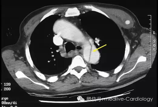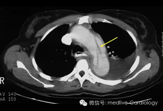 突然发作的胸痛可能是急性主动脉夹层的表现。主动脉内膜一处微小撕裂便可以快速将主动脉壁剥开,并迅速扩展形成假腔(黄色箭头),即使及时诊治,也可能出现致命危险。