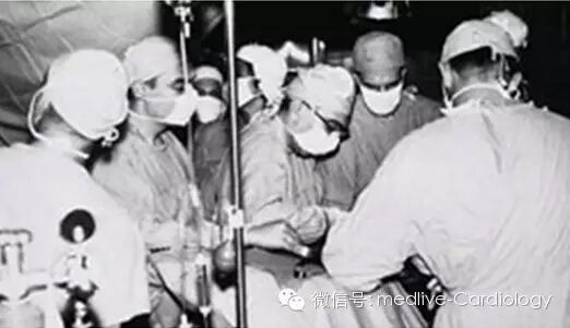 治疗主动脉夹层首先要积极控制血压,降低心肌收缩力,防止心肌的力量进一步撕裂夹层。常用药物有硝普钠、拉贝洛尔和地尔硫卓。控制疼痛首选麻醉药品及阿片类药物,从而减少肾上腺素刺激。药物治疗主要用于那些易于治疗的降主动脉夹层患者。急诊手术用于治疗升主动脉或主动脉弓夹层,通常使用涤纶移植片封闭假腔。手术死亡率一般在10%左右。血管内疗法是一种治疗降主动脉夹层的新兴方法,易于被人们接受。下图是上世纪60年代Michael DeBakey医生完成的手术,这是第一例成功使用涤纶移植片治疗夹层动脉瘤的手术。