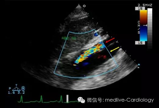 多普勒心脏彩超可以通过检测主动脉内血流存在与否来识别真腔(红色箭头)和假腔(黄色箭头)。超声同样可以用来评估心脏负荷、血管内膜撕裂部位的识别、夹层延长程度、心包积液和主动脉功能不全情况,尤其是对于升主动脉夹层的患者。