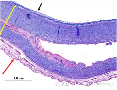 主动脉壁由3层组成(见下图),内膜(黑色箭头)、中膜(黄色条带)、外膜(红色箭头),包含大量各种胶原蛋白、弹性蛋白和平滑肌细胞。随着年龄增长,这些组成部分分解并被嗜碱性基质所替代,这一过程称为囊状中层坏死。这些改变导致主动脉发生撕裂的风险升高,并导致夹层(如图所示)。值得注意的是,囊状中层坏死在1929年被首次描述并沿用至今,但研究已证实这一过程既非囊状也非坏死,因此有些人称之为囊性中层变性。